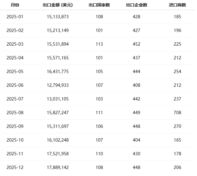 相比之下,6–7月因国际航运紧张及成本上升,出口额短暂回落。总体走势稳健,全年保持在 每月1,500–1,700万美元 区间。