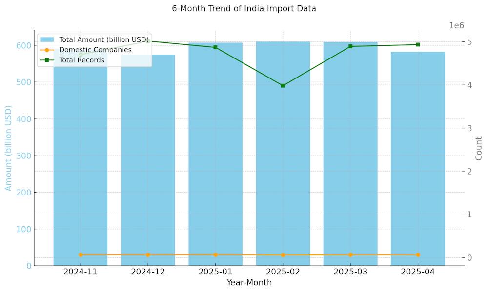 回顾过去半年走势,自2024年11月至2025年4月,印度进口总金额基本维持在590亿至610亿美元区间内波动,至4月略有回调至582.39亿美元。本国参与进口的企业数量长期维持在高位,4月共有59,255家,交易活跃度稳定。同期交易记录数量也持续处于490万笔左右的高水平,显示进口操作的广泛性与品类多样性。