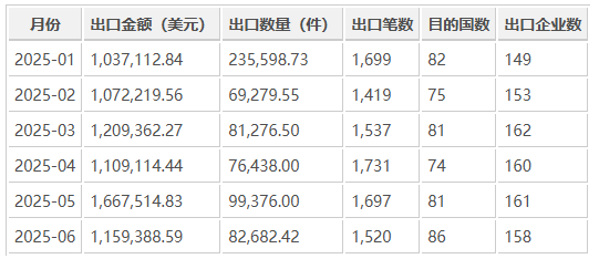 2025 年上半年,印度汽车前照灯出口表现总体平稳,5 月份达到最高值 1,667,514.83 美元,6 月略有回落。