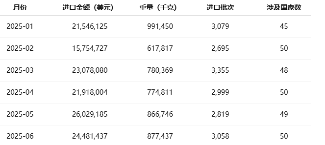 月度走势显示,进口金额由 1 月的 2,155 万美元 稳步提升至 5 月的 2,603 万美元,并在 6 月达到 2,448 万美元 的高点,呈现出“前稳后升”的结构性增长态势,反映出制造业与设备安装周期的带动效应。