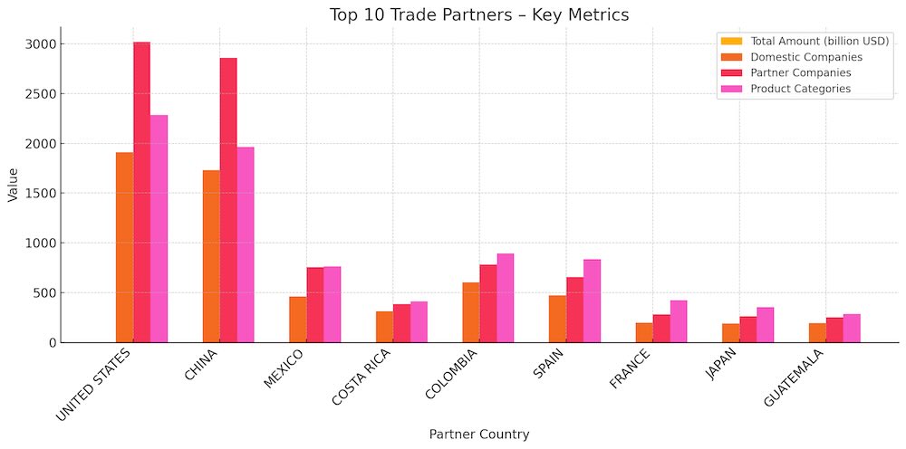 第三位的墨西哥贡献了0.55亿美元的进口额,尽管企业数量较少,仅有461家本国公司与755家墨西哥企业参与,但仍维持了765类商品的活跃贸易,表明区域邻近优势下,墨西哥在食品、建材等领域的供给能力显著。