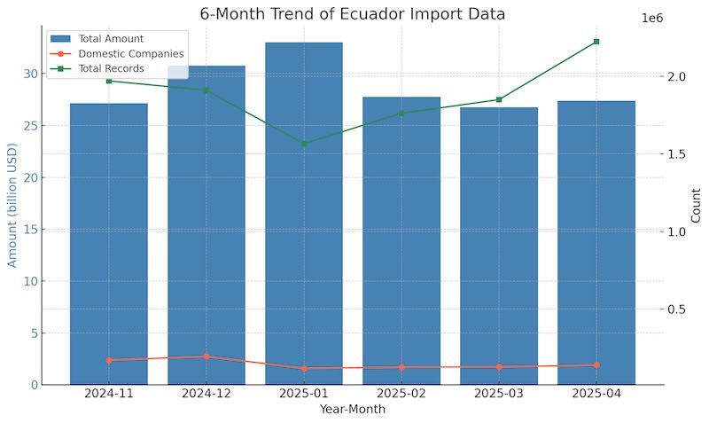 在过去六个月中,厄瓜多尔进口总额呈现出一定波动。2024年11月为271.3亿美元,12月大幅上升至307.6亿美元,2025年1月进一步增长至330亿美元,创下阶段高点;2月回落至277.7亿美元,3月下降至267.5亿美元,4月则略有反弹至273.8亿美元。从企业活跃度来看,本国公司数量从年初的11.7万家增加至4月的13.8万家,交易量同步攀升,反映市场主体参与度增强,采购节奏有所恢复。