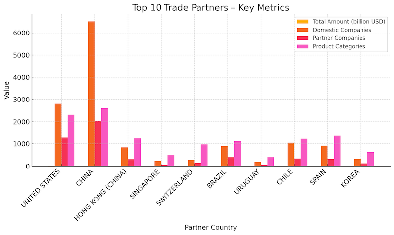 从国别结构来看,美国以11.41亿美元继续领跑秘鲁的进口来源,占据总额约四分之一。本月有2,801家秘鲁采购商与1,283家美国供应商开展贸易,商品种类达2,312种,覆盖面广泛、合作基础稳固。中国则以7.16亿美元位居第二,活跃度尤为突出——有6,516家本国采购商与2,021家中国供应商发生贸易,涉足商品种类达2,610种,显示中国商品对秘鲁市场的强吸附力。来自中国香港的进口额达2.66亿美元,主要由842家采购商和307家供应商促成,体现出其在电子及中间品领域的角色。新加坡则以2.56亿美元位列第四,商品种类虽仅492种,但体现出较高单品集中度,适应特定行业的高端需求。除前四国之外,瑞士、巴西、乌拉圭、智利、西班牙和韩国合计贡献逾10亿美元的进口额,进一步佐证秘鲁市场的多元依赖格局和稳定供应网络。