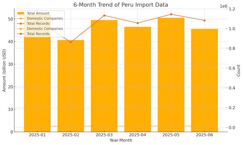 回顾过去6个月走势,秘鲁进口金额在1月达到51.95亿美元的高点后,于2月大幅回落至40.66亿美元,随后在3月反弹至49.53亿美元。4月、5月分别录得46.55亿与50.49亿美元,6月则再次出现下行。从企业活跃度看,参与进口的本国企业数量始终维持在1.1万至1.3万之间,数据记录条数亦相对平稳,反映市场仍具一定韧性与结构性调整能力。