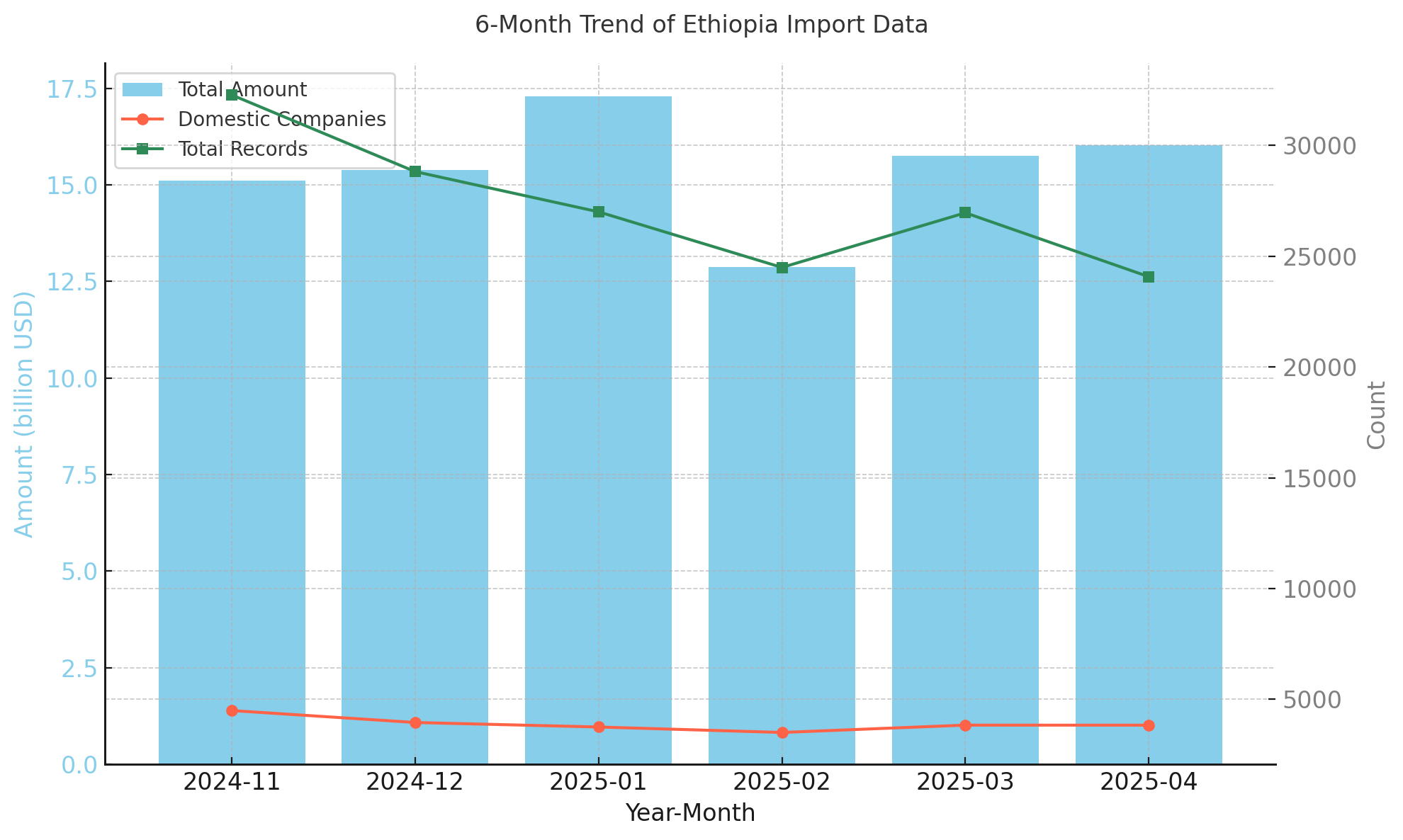 过去六个月中,埃塞俄比亚进口金额整体波动明显,2025年1月达到17.29亿美元的高位后,于2月降至12.87亿美元,随后逐步回升。4月的16.02亿美元虽然仍未及年内峰值,但与2月相比已大幅反弹。同期的本国公司数量从11月的4,496家下降至4月的3,837家,显示出企业参与度的阶段性调整,而记录条数在近两月呈小幅回落态势。