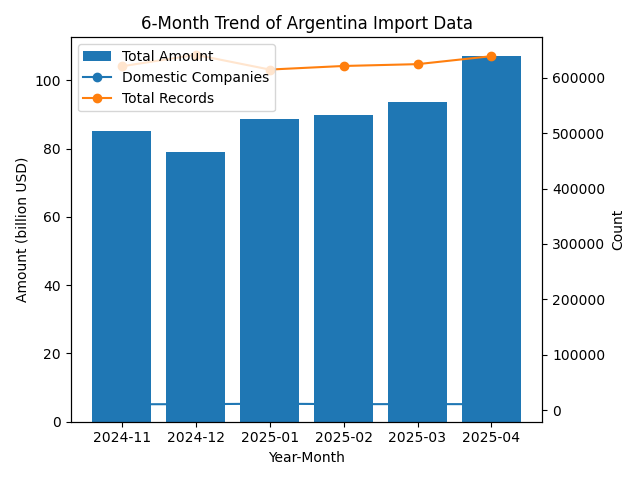 从2024年11月至2025年04月,阿根廷进口金额呈现先降后升再突破新高的态势。2024年11月进口金额85.05亿美元,此后于12月因年末采购调整下降至79.14亿美元,2025年1月重回88.84亿美元,2月小幅上扬至89.90亿美元,3月进一步增至93.71亿美元,4月则跃升至107.28亿美元;企业活跃度方面,11月本国企业数量10,910家、12月小增至11,031家,1月峰值达11,897家,随后2月至4月在11,000家上下波动;数据记录总量亦从62.05万条逐步攀升至本月的63.88万条,显示采购活跃度与交易规模同步扩张。