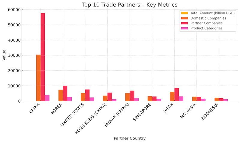 从主要贸易伙伴来看,中国以170.34亿美元的进口额稳居首位,涉及30,436家本国采购商和57,775家中国供应商,涵盖商品种类达3,987种,是越南最关键的进口来源国。韩国以54.57亿美元位列第二,合作密度也较高,共有7,468家本国企业与10,047家韩国公司建立贸易联系,涉及2,653类商品,电子与高端制造相关品类尤为突出。美国则以27.44亿美元居第三,5,263家越南企业从7,571家美国供应商中采购2,324类商品,重点集中在高科技与农业相关产品。香港地区以21.80亿美元排名第四,合作企业数量与商品种类虽略低于前三,但在高值电子器件与金融用品领域发挥显著作用。