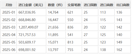 2025 年上半年秘鲁滑动轴承进口波动明显,3 月为峰值月份,进口额高达 1,207,499.07 美元,随后在 5 月、6 月保持稳健。