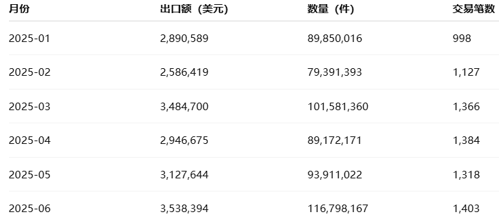 从月度走势来看,2025年上半年越南PLASTIC CAP出口呈现稳中有升态势,尤其在3月至6月保持较高水平。
