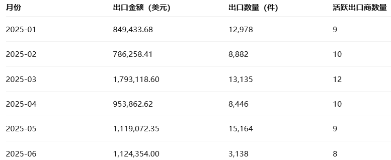 2025年上半年,印度API出口在季度间呈现明显波动。3月出口额最高,达 1,793,118.60 美元,4月至6月略有回落,但仍保持稳定。