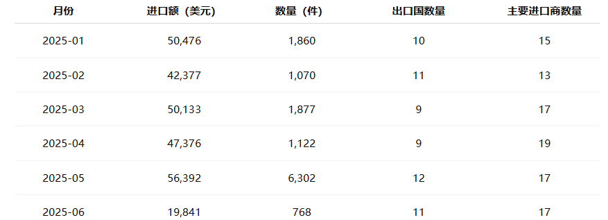 从表中可见,5月进口额达到 56,392美元,占上半年总额的 21.2%,为全年最高峰。这一增长与春季服装出口订单周期密切相关。1月至4月期间,进口金额保持在4万至5万美元区间,显示制造端稳定补货。6月小幅下降,主要因海关申报批次减少及部分企业提前完成采购计划。