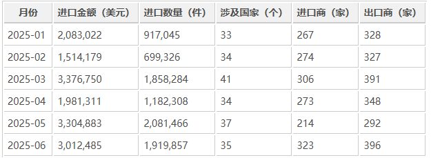 从图表可见,2025年3月和5月的进口额均超过 300万美元,其中3月增长主要来自半导体测试及电子制造设备的集中采购,而5月则与汽车零部件行业的备货周期相关。