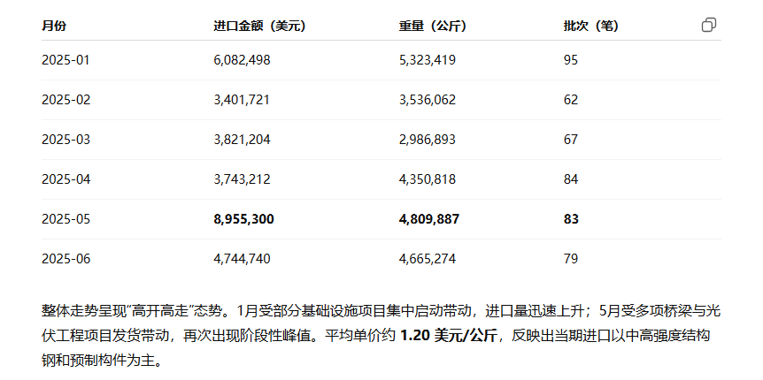 整体走势呈现“高开高走”态势。1月受部分基础设施项目集中启动带动,进口量迅速上升;5月受多项桥梁与光伏工程项目发货带动,再次出现阶段性峰值。平均单价约 1.20 美元/公斤,反映出当期进口以中高强度结构钢和预制构件为主。