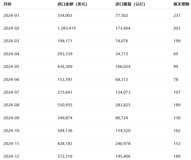 全年进口金额环比总体上升,尤其2月单月进口额超过 138万美元,创年度最高值。8月与12月的高峰反映出企业在年度生产计划与库存补充周期中的集中采购行为,显示出矿山设备与建筑机械领域的持续扩张。