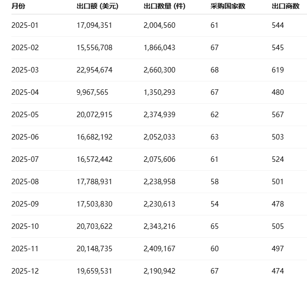 从整体节奏来看,出口额在年初的1月(约1,709万美元)与2月(约1,556万美元)处于温和水平,至5月达到 约2,007万美元,并在年中维持稳定,至年末12月达到全年高点 约1,966万美元。