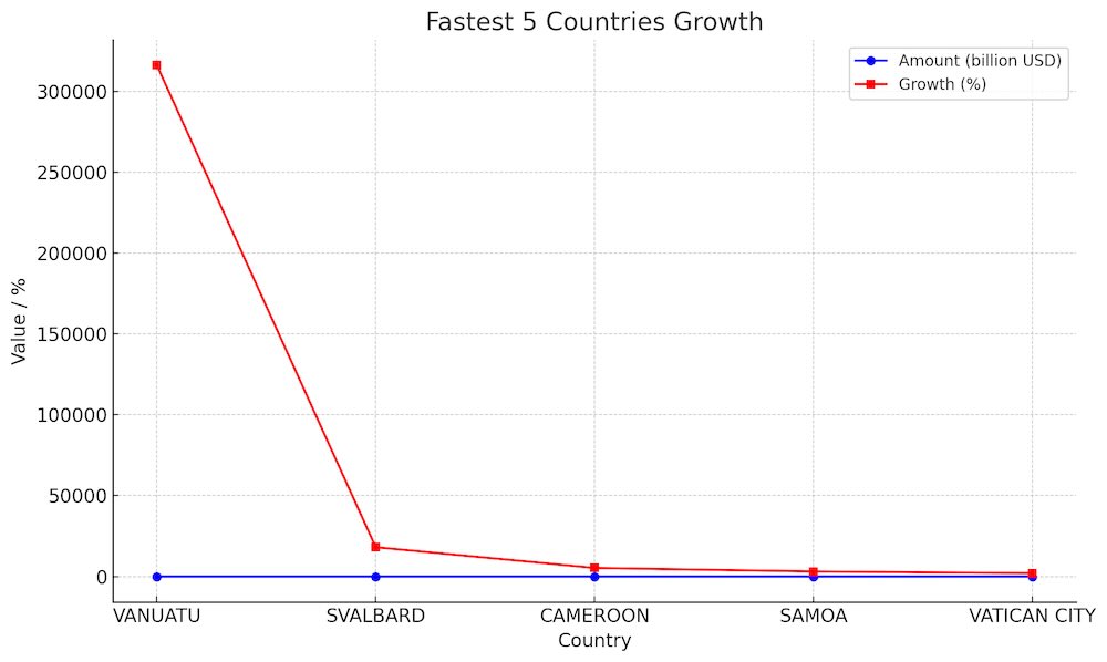 俄罗斯以538亿美元居次位,尽管企业数量相对有限,但凭借能源与原材料优势占据重要地位。