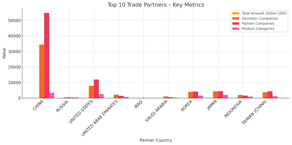 此外,包括伊拉克、沙特、韩国、日本、印尼与中国台湾地区在内的其他六大贸易伙伴,共计贡献逾1,200亿美元进口金额,形成稳定多元的供应生态。