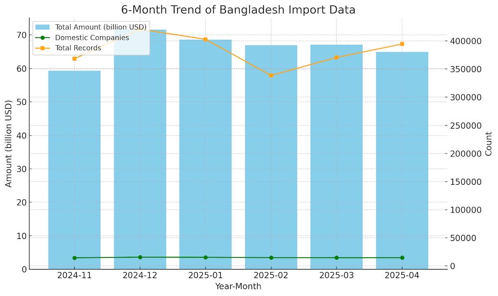 回顾过去6个月走势,孟加拉进口金额自2024年12月的71.58亿美元高位起逐步回落至本月的64.94亿美元。尽管金额波动,但参与进口的本国企业维持在14,000家以上,尤其本月达14,706家,反映出实际经营活跃度仍具韧性。记录条数亦连续两月上升,预示中小单据与零散交易增长。.jpg)