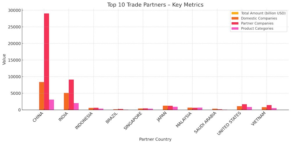 印度以8.51亿美元位居第二,商品种类超过2,000类,孟方采购商5,102家,与印度9,119家供应商保持高频交易,涵盖原材料、机械、化工及纺织辅料等领域。