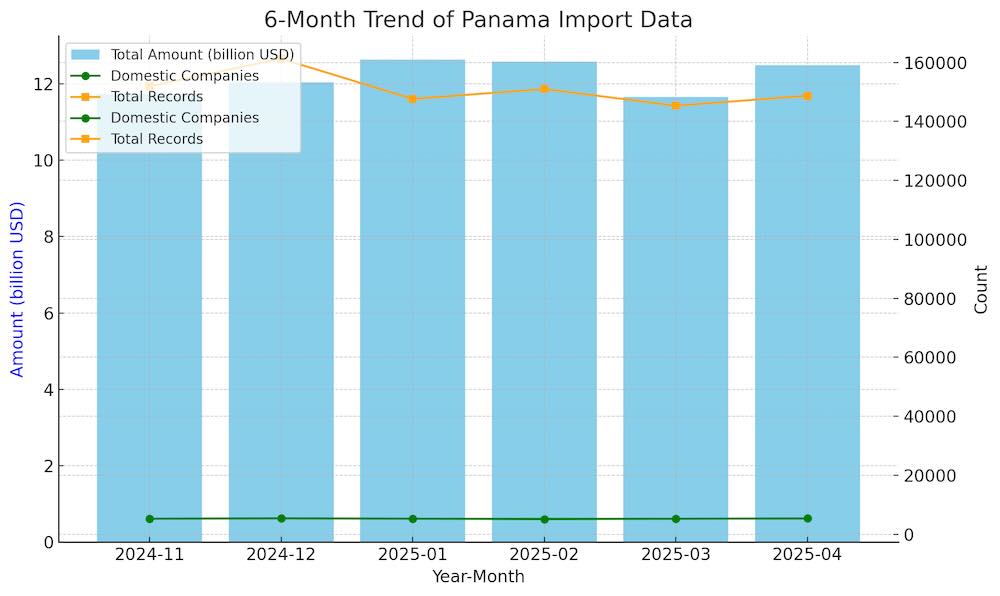 近6个月趋势分析显示,2024年11月至2025年4月,巴拿马进口金额整体波动不大,从11月的117.3亿美元逐步攀升至本月的124.9亿美元。企业活跃度方面,参与进口的本国公司数量整体保持稳定,略有起伏,从2024年12月的5404家下降至2025年2月的5160家后再次回升至当前的5354家。数据记录数量也相对稳定,体现了巴拿马在全球供应链中的持续活跃角色。