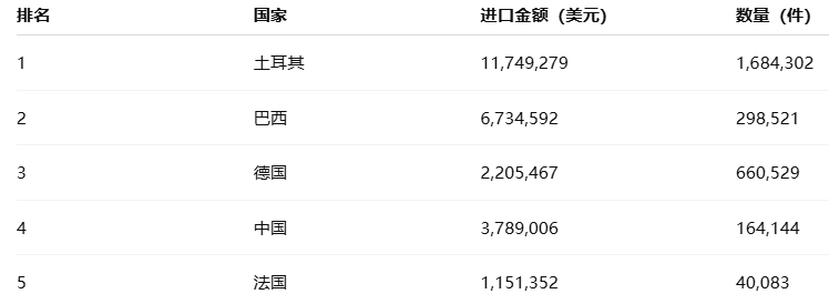 土耳其在汽车零部件制造上具有强大的加工与配套优势,是乌拉圭市场最主要的来源国。其供货涵盖车门、保险杠、结构件等中大型金属部件。巴西位居第二,凭借南共市(Mercosur)贸易便利与地域邻近,在价格上更具竞争力。