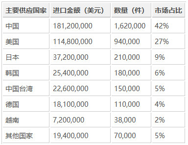 从进口来源分布来看,亚洲国家在墨西哥电缆供应链中占据主导地位。中国以超过 1.8 亿美元的出口额位居首位,占整体市场的 42%。其次为 美国(27%) 与 日本(9%),韩国、德国及中国台湾分列其后。