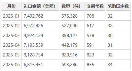 2025 年上半年,墨西哥电缆线进口总体保持稳健增长态势。从月度来看,5 月进口额达到 9,128.75 万美元,为上半年最高点,6 月虽略有回落,但仍处于高位,显示制造业与汽车组装工厂的采购需求持续旺盛。