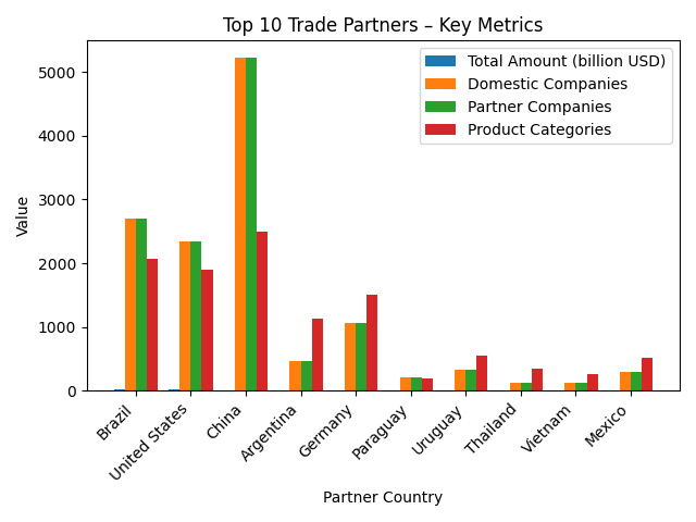 本月,巴西位居阿根廷最大进口来源国,进口金额26.22亿美元,涉及本国采购商2,696家,商品种类2,064种,继续巩固南美区域供应链优势;美国紧随其后,进口额19.21亿美元,本国采购商2,348家,涵盖1,904种商品,凸显其多元化高端制造品的供给能力;中国以13.64亿美元位列第三,本国采购商5,229家,商品种类2,492种,已成为阿根廷市场不可或缺的关键伙伴;第四大进口来源阿根廷自身境内货物返回金额5.89亿美元,本国采购商472家,商品种类1,138种,主要集中在设备与材料类。其余六国累计进口17.45亿美元,共计3,394种商品,呈现出较强的地域与产品多样化特点。