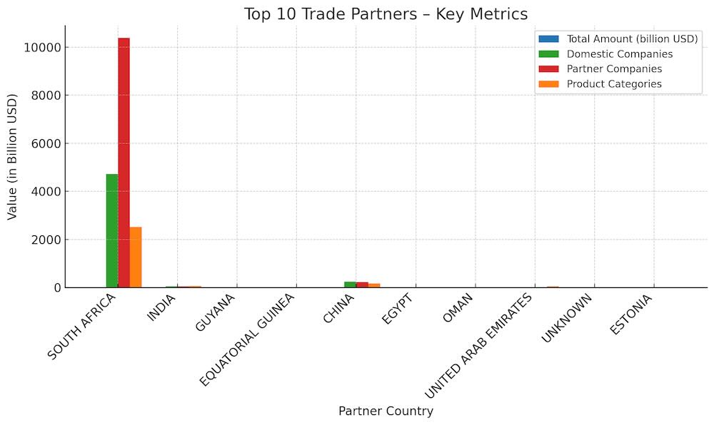 印度紧随其后,进口金额为0.81亿美元,采购商数量为42家,供应商为52家,商品种类有58种。其他重要的贸易伙伴还包括圭亚那、赤道几内亚和中国。尤其是赤道几内亚,其贸易额环比增长了553,428.37%,表现出两国间贸易活动的快速增长。