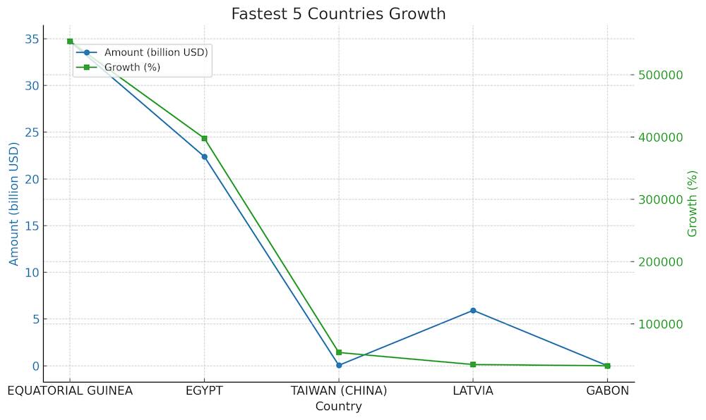 在2025年4月,进口增长最快的五个国家中,赤道几内亚和埃及的增长最为显著。赤道几内亚的进口金额从上月的6,273美元跃升至3,472.34万美元,环比增长了553,428.37%。埃及的增长同样强劲,进口金额增长了397,845.69%,达到2,237.89万美元。