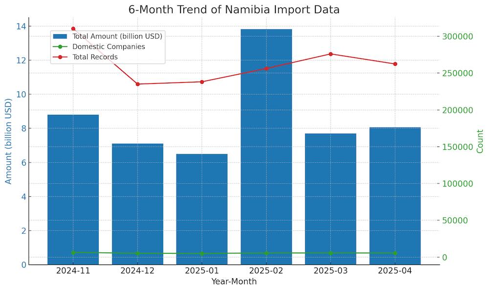 在2025年4月,纳米比亚的进口活动由一系列本国公司主导。以下是一些主要公司及其采购的商品类别: