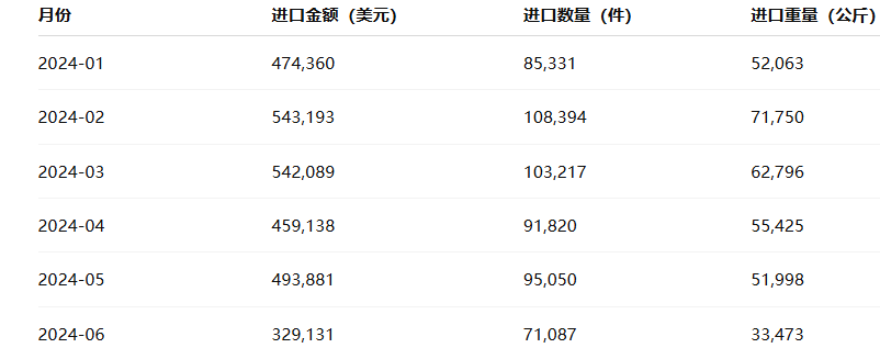 从月度统计数据来看,印尼齿轮进口在2024年上半年呈现平稳增长趋势:
