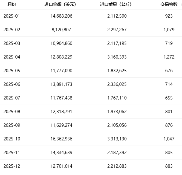 第四季度:受年末装配计划与补货需求带动,季度进口额高达 4,330 万美元,为全年最高峰。