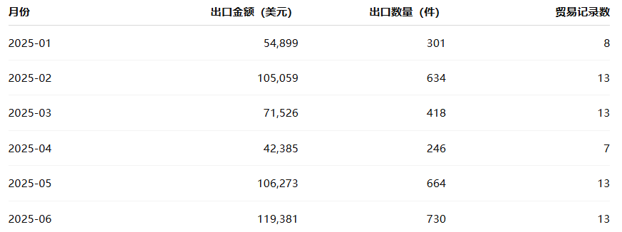 值得注意的是,在整个统计周期内,该产品出口仅涉及 1 个贸易国家,且出口商与进口商各只有 1 家,显示出高度集中的贸易结构。这一特征与 DEF 液罐在汽车排放系统中的专业属性高度一致。