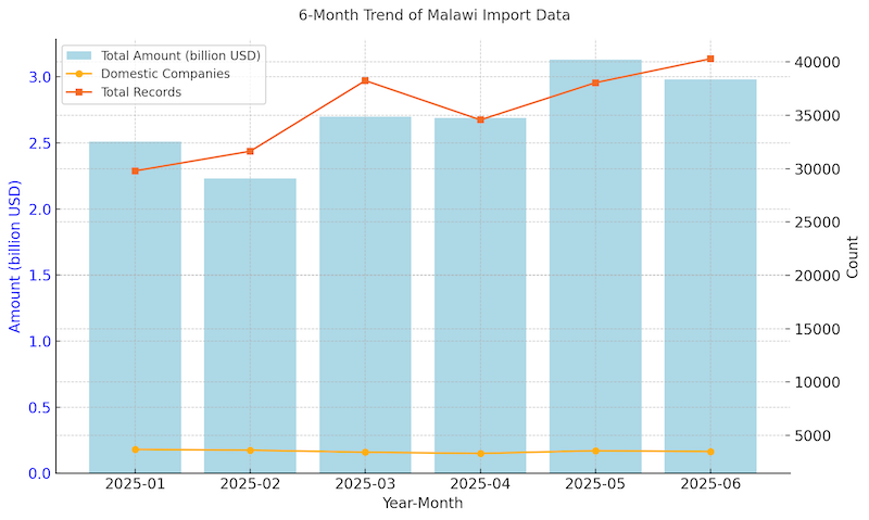 过去六个月,马拉维进口金额整体保持波动上升趋势。从1月的25.1亿美元增长至5月高点的31.3亿美元后,于6月回落至29.8亿美元。国内活跃采购商数量从年初的3683家小幅变动至3482家,总记录条数则稳步上升,6月达到40303条,创下半年新高。整体来看,进口规模虽有波动,但活跃度持续增强,显示市场对进口需求的稳定性。
