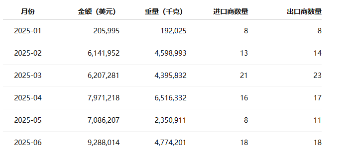 总体来看,2025 年上半年进口额分布较为均衡,其中 6 月份进口额占全年上半段的 25% 以上,显示出项目建设高峰期的集中采购特征。