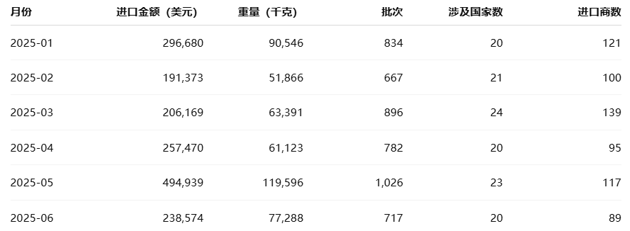 总量稳中有升,上半年累计进口额达 168.5 万美元;