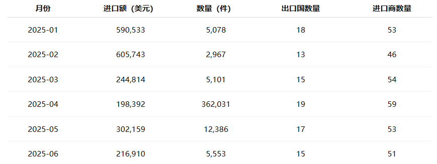 从月度数据来看,2025年上半年巴拉圭高精度仪表进口总体稳定,2月与5月为主要高峰期。