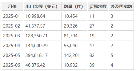 从月度数据看,印度净水器配件出口在2025年5月达到高峰,金额 394,818 美元,占上半年总额的 51.5%。自2月至4月间保持在 4 万至 14 万美元区间,6月略有回落。