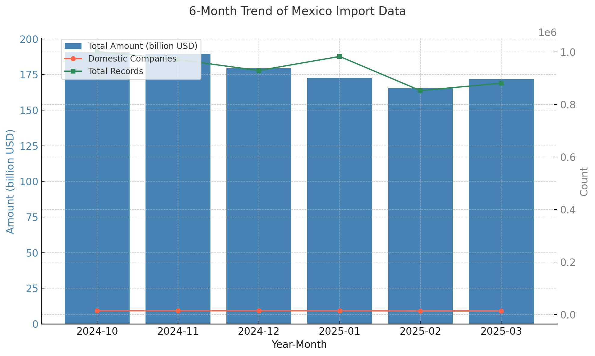 2025年3月,墨西哥进口总额达171.80亿美元,较上月增长3.73%,录得贸易记录881,115条,显示出墨西哥外贸需求阶段性回升。结合商品结构与贸易伙伴分析可见,新能源车辆与锂电池进口大幅跃升,正推动墨西哥进口结构持续向高技术与能源转型方向升级。