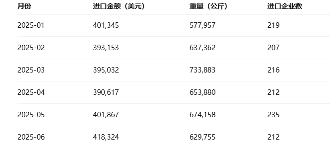 从趋势来看,进口额在六个月内基本保持在40万美元上下的稳定水平。其中2月进口量最大,受节前消费与批发补货需求推动;3月至6月逐步回落,反映出市场库存充足、消费趋稳的特点。