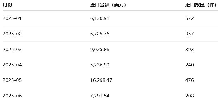 整体来看,1—3月为建筑施工和零售备货期,4月略有回落,5—6月随着雨季结束、施工复工,进口量与金额双双回升。特别是5月,进口额达到16,000美元,占全期总额的三分之一。