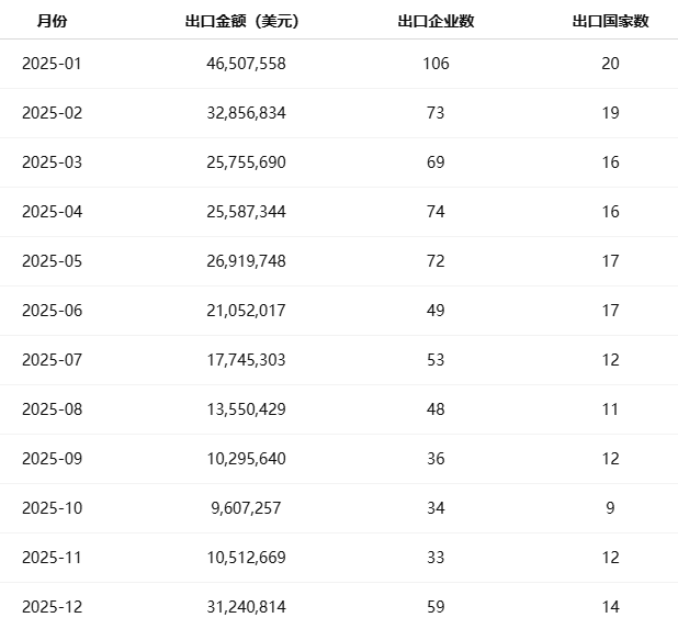 从月度表现来看,2025年芝麻出口在年初达到高点,随后略有回调并于下半年稳步上升。3月、5月与12月均出现小幅反弹,显示出出口节奏与收获周期的匹配性。