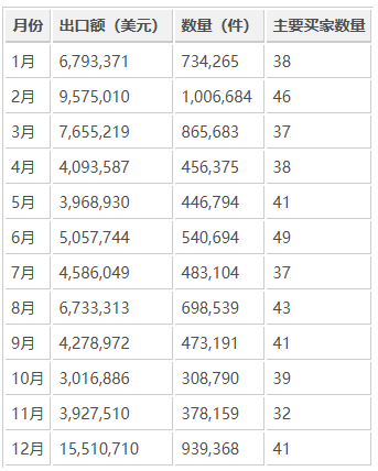 全年中,出口高峰出现在12月(出口额约1,551万美元)和2月(出口额约957万美元),反映了欧美时装季节性需求的集中爆发。相对较低的月份为10月与11月,但整体波动幅度有限,显示出订单的持续稳定。