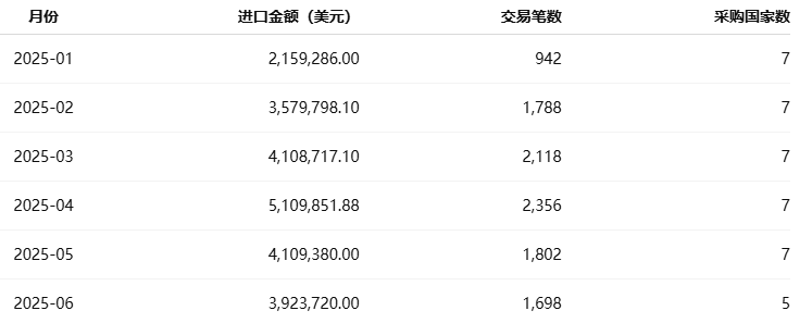 2025年上半年,哈萨克斯坦乘用车进口额呈现稳定增长态势。进口金额从 1 月的 2,159,286 美元逐月攀升至 6 月的 3,923,720 美元,显示出市场活跃度不断提升。整体而言,哈萨克斯坦汽车消费的恢复力强劲,尤其在中高端与新能源细分领域。